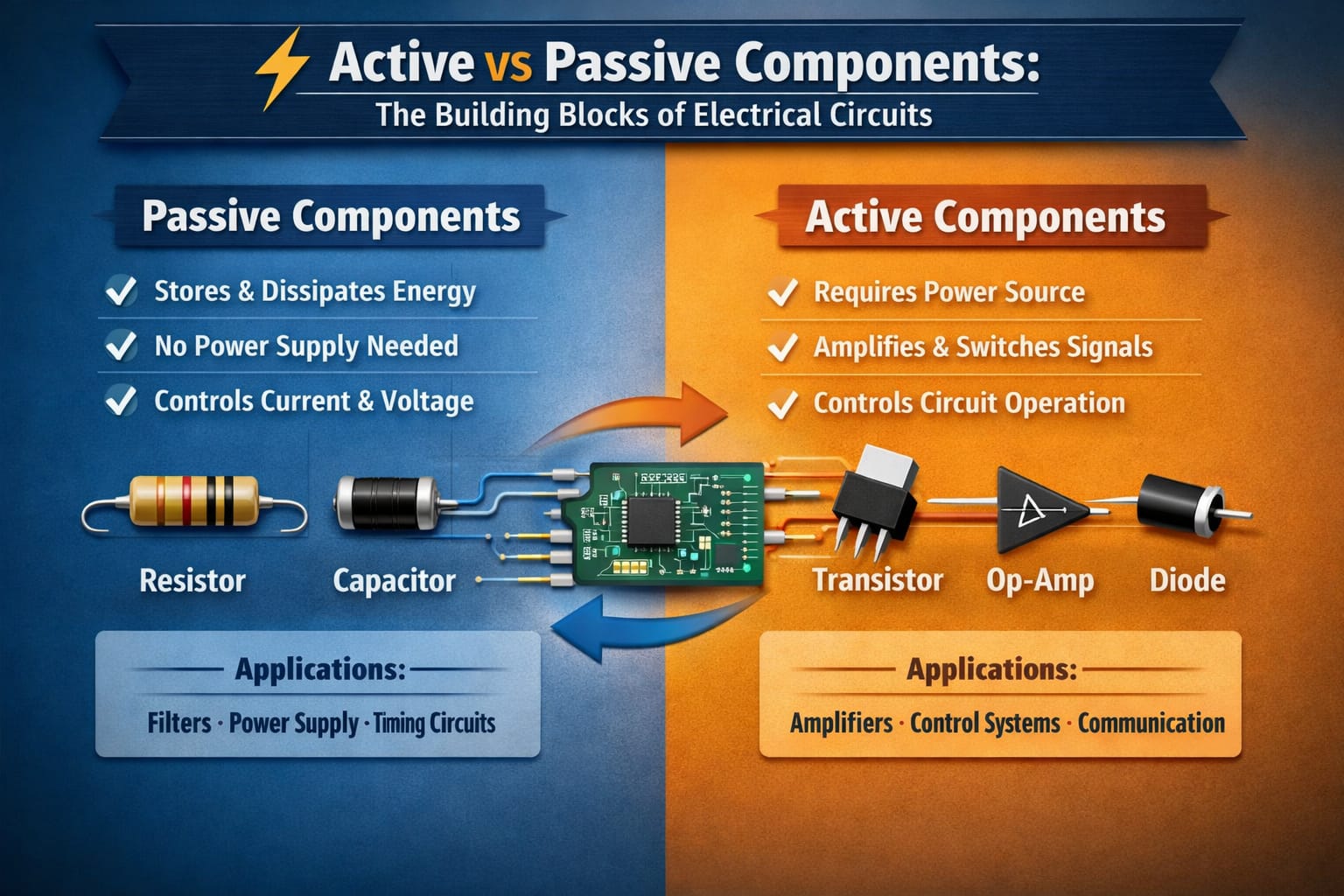 Electrical circuits are made up of different types of components that control the flow of electrical energy. Active Components and Passive Components are two fundamental categories used in electrical circuit design.