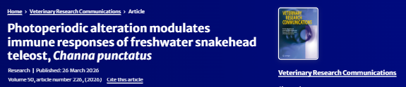 The study investigates the influence of photoperiod (light-dark cycles) on the immune responses of the freshwater fish Channa punctatus. The findings demonstrate that variations in photoperiod significantly affect innate immune functions, including phagocytic activity and lymphocyte proliferation, with notable responses observed in key immune organs such as the head kidney and spleen. The study highlights the adaptive role of environmental light conditions in modulating fish immunity. This work contributes to a better understanding of environmental regulation of immune function and holds relevance for aquaculture and fish health management.